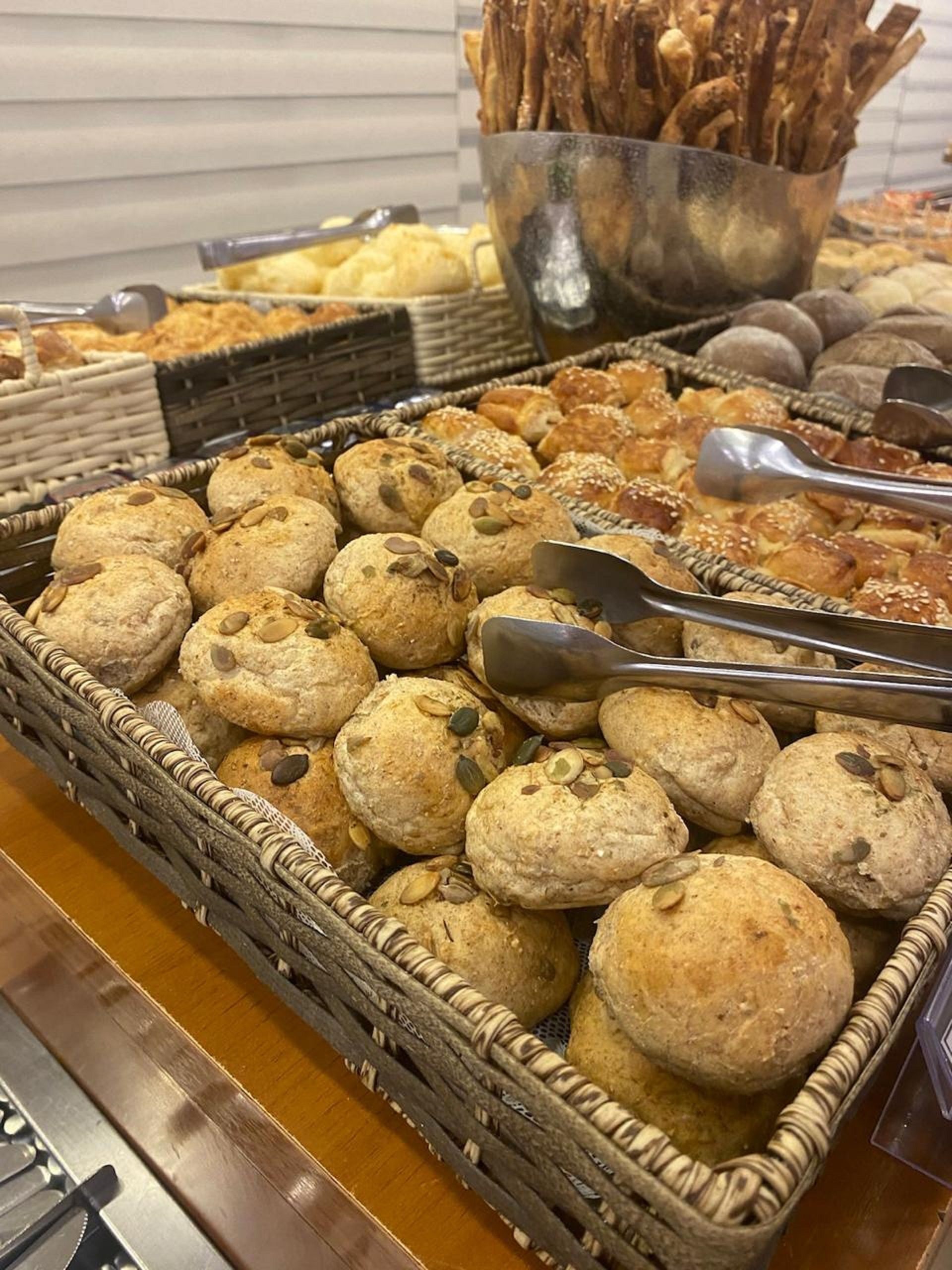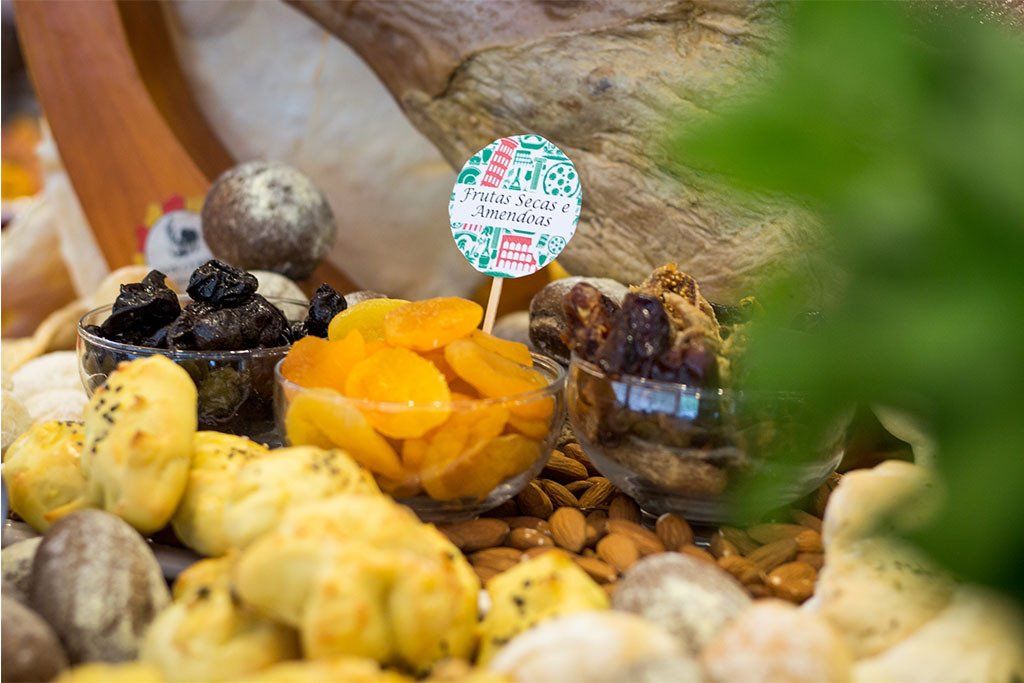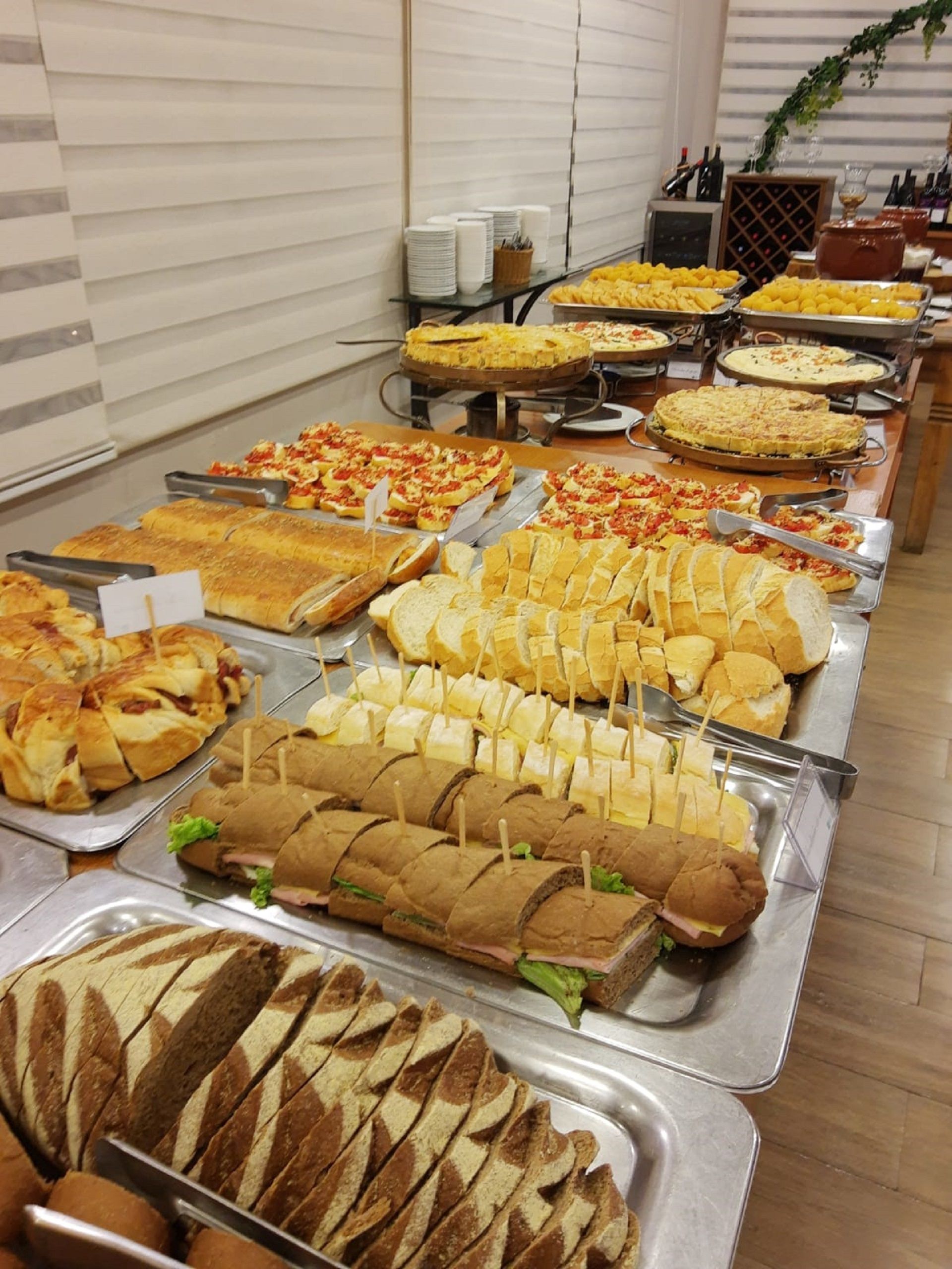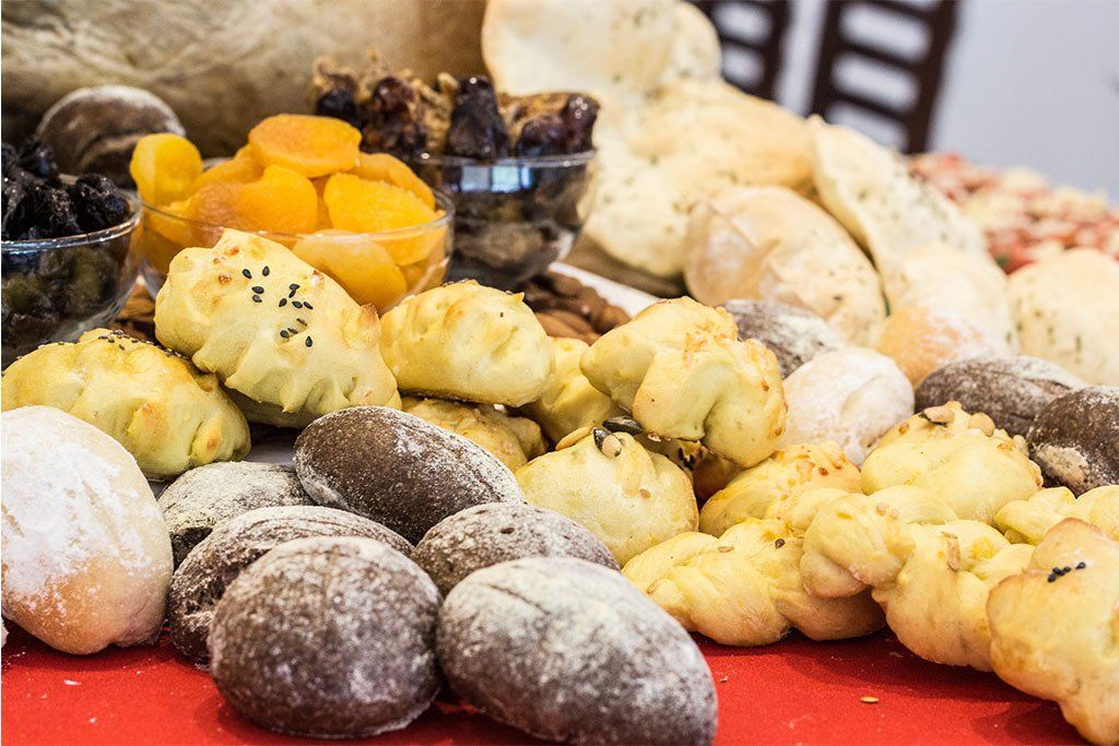 Pães: pães variados, com e sem recheio. Todos os itens são de fabricação própria, e preparados e assados exclusivamente para esta noite.