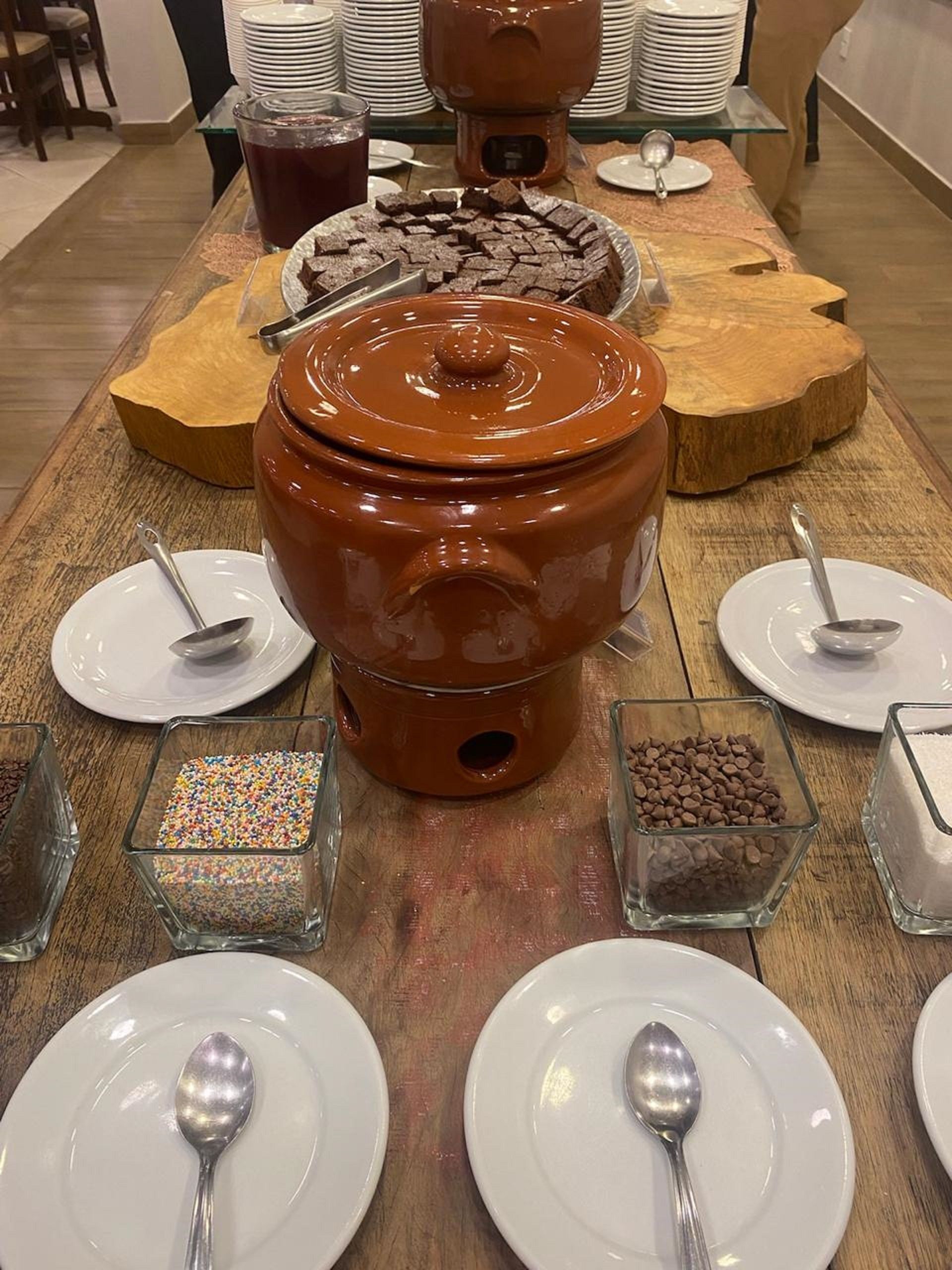 Sobremesa: bolinho caseiro, fondue doce, acompanhamentos, sagu e arroz doce. Os sabores do bolo e do fondue variam toda semana.
